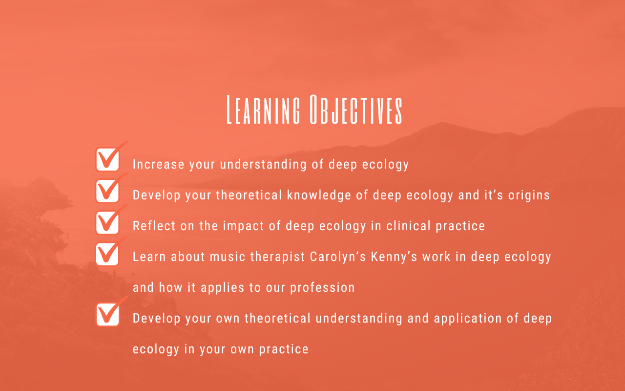 This tutorial is a current look at the philosophy of deep ecology and how it can impact your music therapy practice.