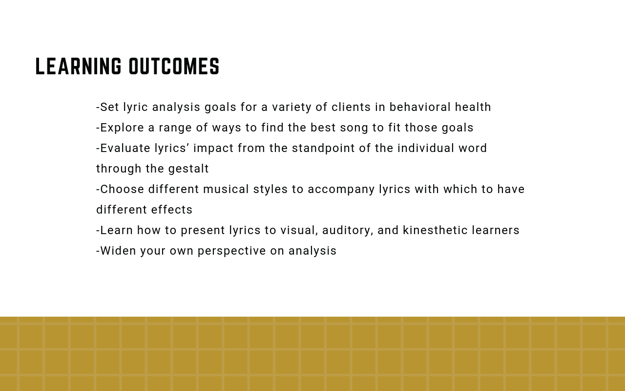 I loved the lyrics analysis course. It is very comprehensive as it covers both the practical side of the application as well as evidence-based references. I have been using the techniques I learnt from Danny at work (mental health hospital setting). The techniques are particularly useful in psycho-education and helping patients with developing insights through looking at the lyrics supported by awesome music.