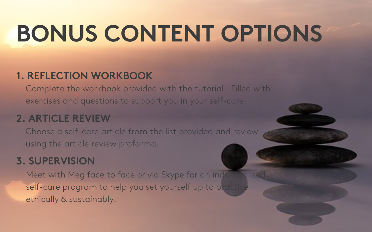 Dr Meg Steele teaches at the University of Melbourne and has a research focus on integrating music into schools. She has undertaken an incredible journey with her own self-care and now wants to help other music therapists thrive in their life and career, so that they may in turn support others. Meg is passionate about supporting music therapists self-care practice through a range of engaging strategies and activities. She has created this tutorial to share her vast knowledge & expertise on self-care.
