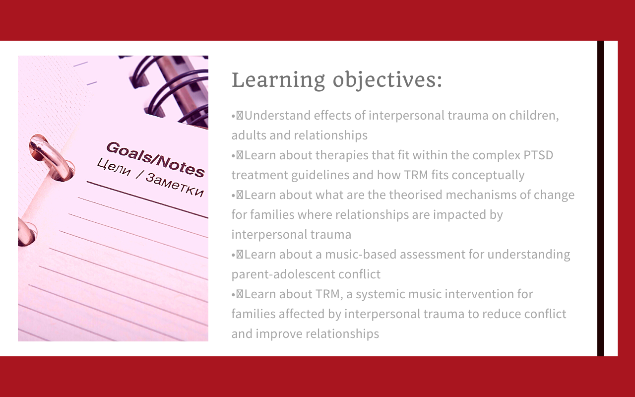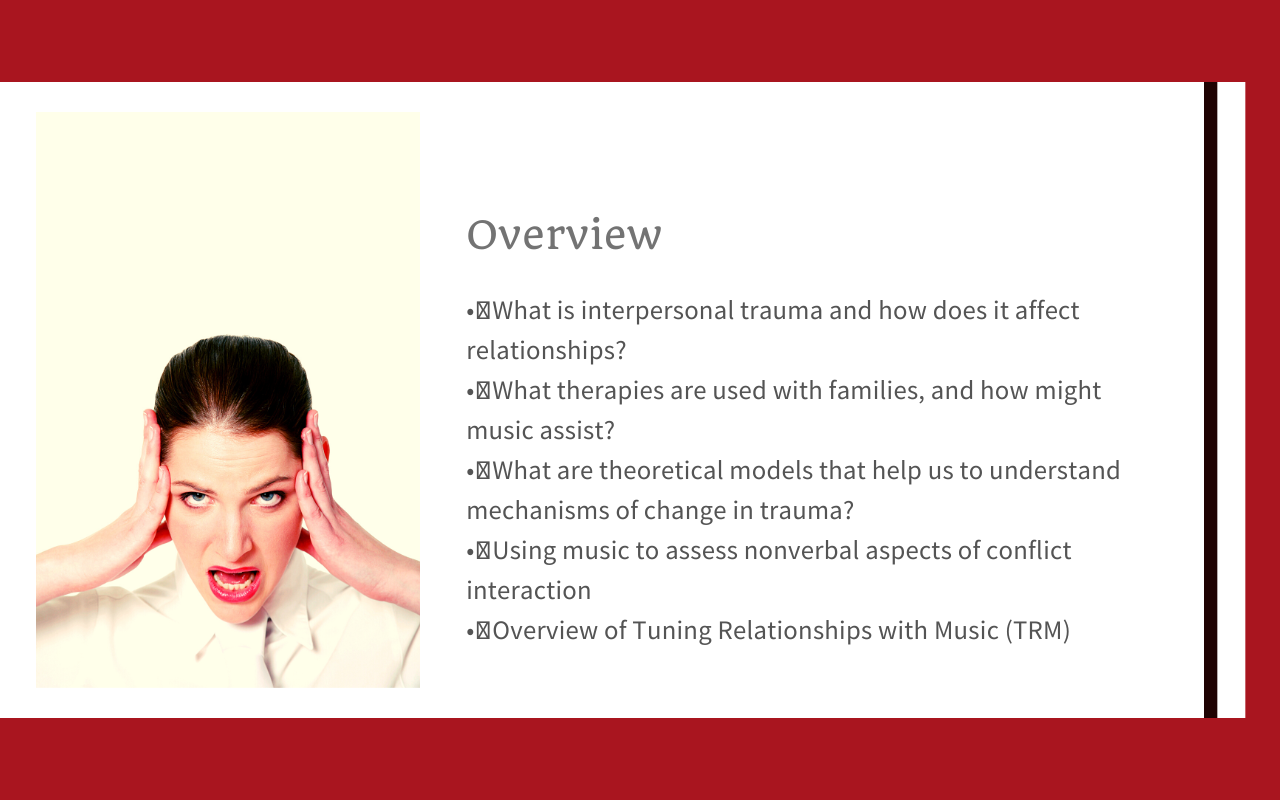 The tutorial includes definitions of interpersonal trauma and the impact on families, limitations to traditional trauma therapy models and proposes a new program model which integrates psycho-education, emotion coaching and music as a vehicle to teach non verbal communication skills.